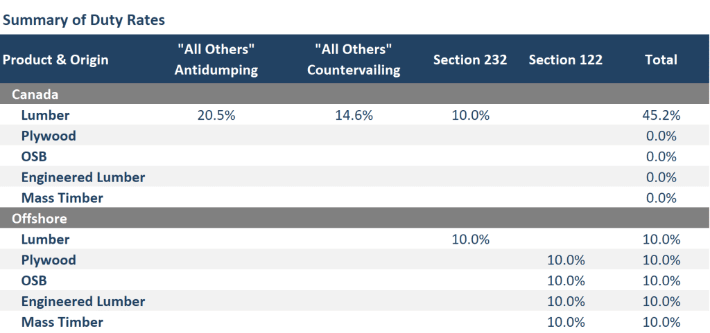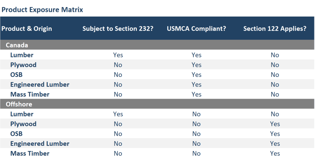 - Offshore plywood, OSB, engineered lumber, and mass timber products are subject to Section 122 because they are neither USMCA compliant nor covered by Section 232.